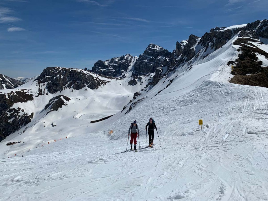 Teilweise folgend wir der Piste, teilweise zweigen wir neben der Piste ins Gelände ab. Da der Schnee angetaut ist, ist das Steigen sehr fein und nicht rutschig. Nur in ein paar schattigen Stellen ist die Oberfläche vereist.