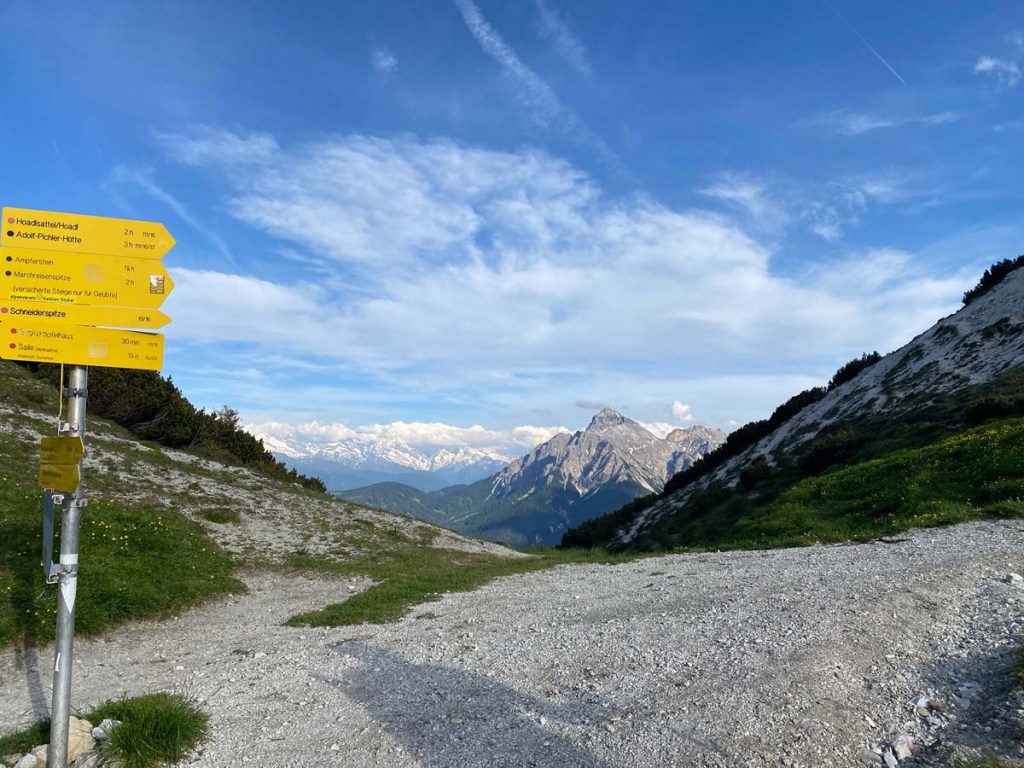 Michi macht das Tempo, und so erreichen wir innerhalb kurzer Zeit das Halsl. An diesem Übergang ins Stubai teilen sich die Wege. Wir wandern heute weiter in Richtung Saile, man könnte aber weiter auch auf den Ampferstein oder eben ins besagte Stubai (über Pfarrach)