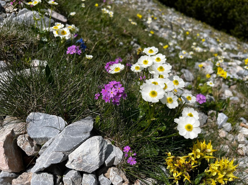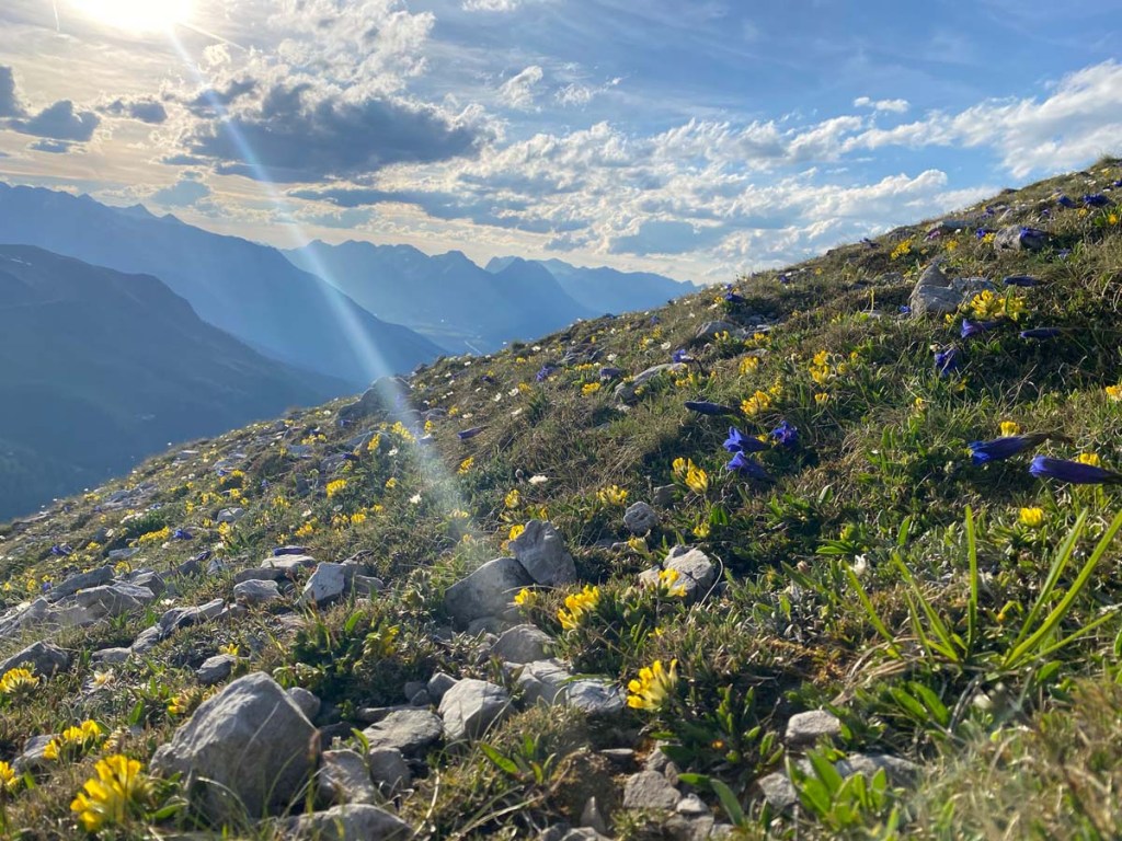 Und überall um uns herum sehen wir die Blumenpracht, für die dieses Gebiet bekannt ist. „Enzian“, „Platenigl“, „Kuhschellen“, „Leimkraut“, sogar das seltene „Bunte Läusekraut“ finden wir.