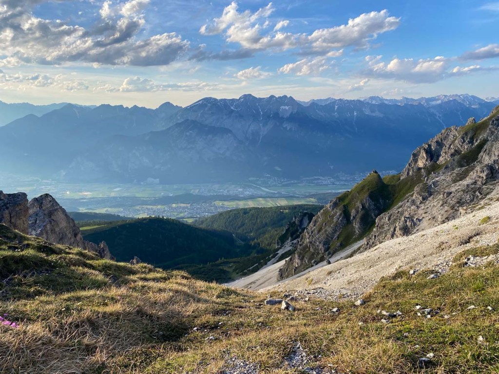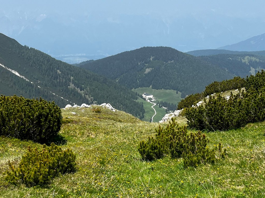 Im Hintergrund können wir das Wipptal und den Patscherkofel erkennen, die diesige Luft vereitelt einen tollen Weitblick.