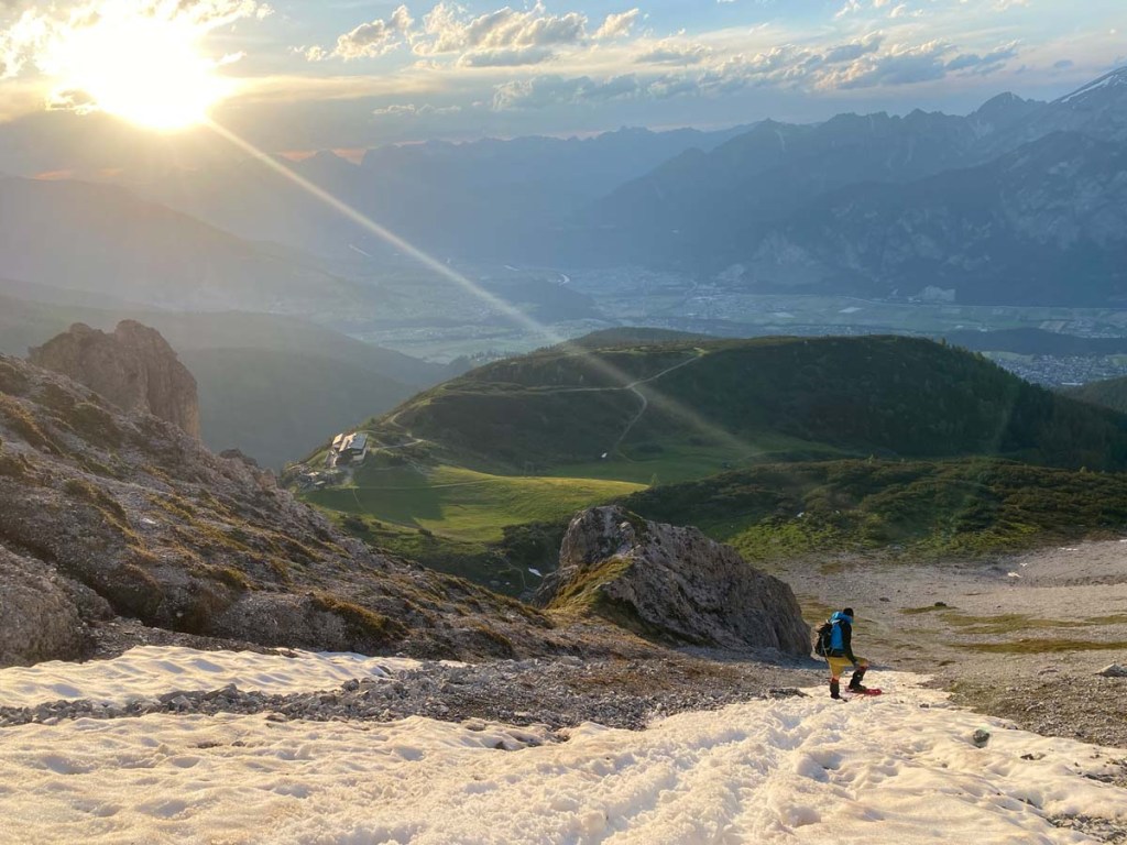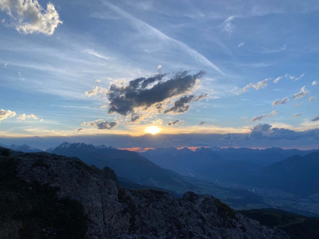 Beim weiteren Abstieg über den steilen Bergpfad hinunter zur Axamer Lizum können wir ein wunderschönes Farbenspiel am Himmel beobachten.