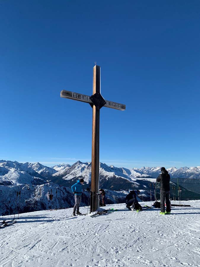 Schließlich erreichen wir den Hoadl, mit dem neben dem modernen Hoadlhaus unscheinbaren Kreuz. Es sind gefühlt mehr Tourengeher als Skifahrer am Weg…