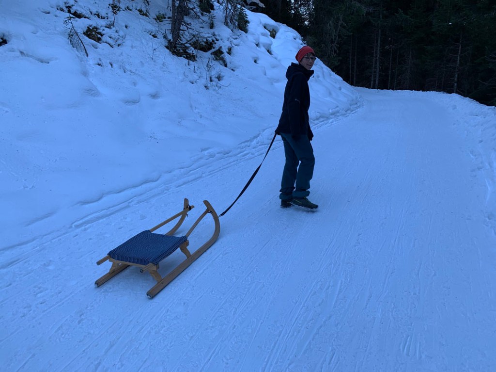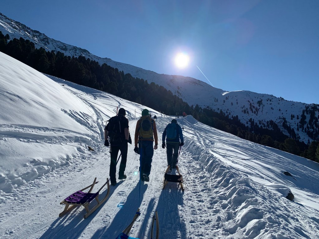 Einziger Wermutstropfen ist der gemeinsame Aufstieg auf der Abfahrtspiste. Aber da noch nicht viele Rodler unterwegs sind, ist das kein Problem. Hier im Tal herrscht Winter, anders als im Inntal…