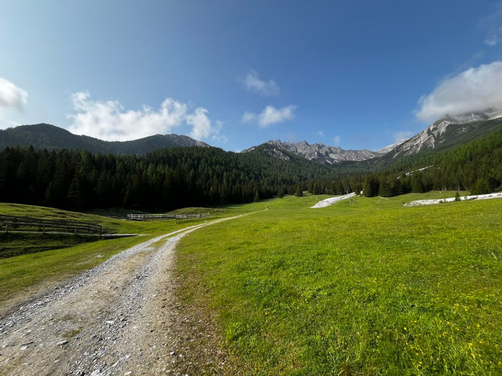 Der erste Teil des Weges führt wieder bis zur Kaserstattalm, dann fahren wir geradeaus, parallel zum Tal immer geradeaus auf den Patscherkofel zu.