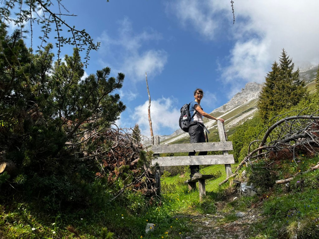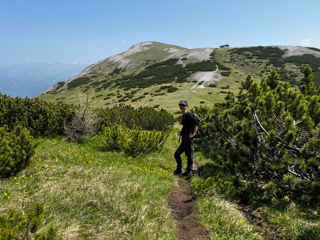 Erst über Almwiesen, dann durch lichten Wald und Latschenfelder steigen wir immer höher.
