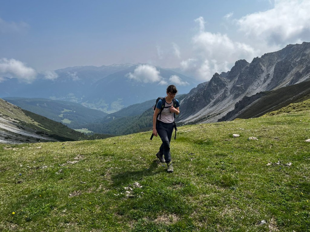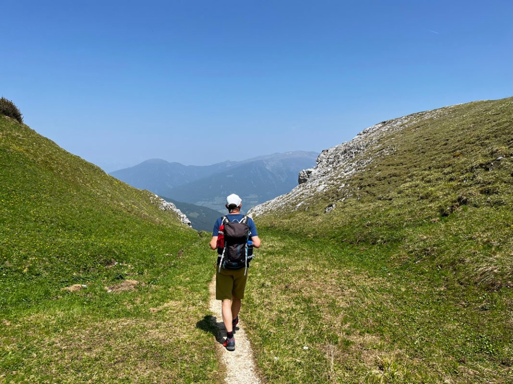 Der Weg vom Blaser bzw. der Blaserhütte ist erst angenehm flach, dann fällt er bei einer Geländekante steil nach unten. Immer noch sehr gut begehbar, aber die Steilheit ist in den Beinen spürbar.