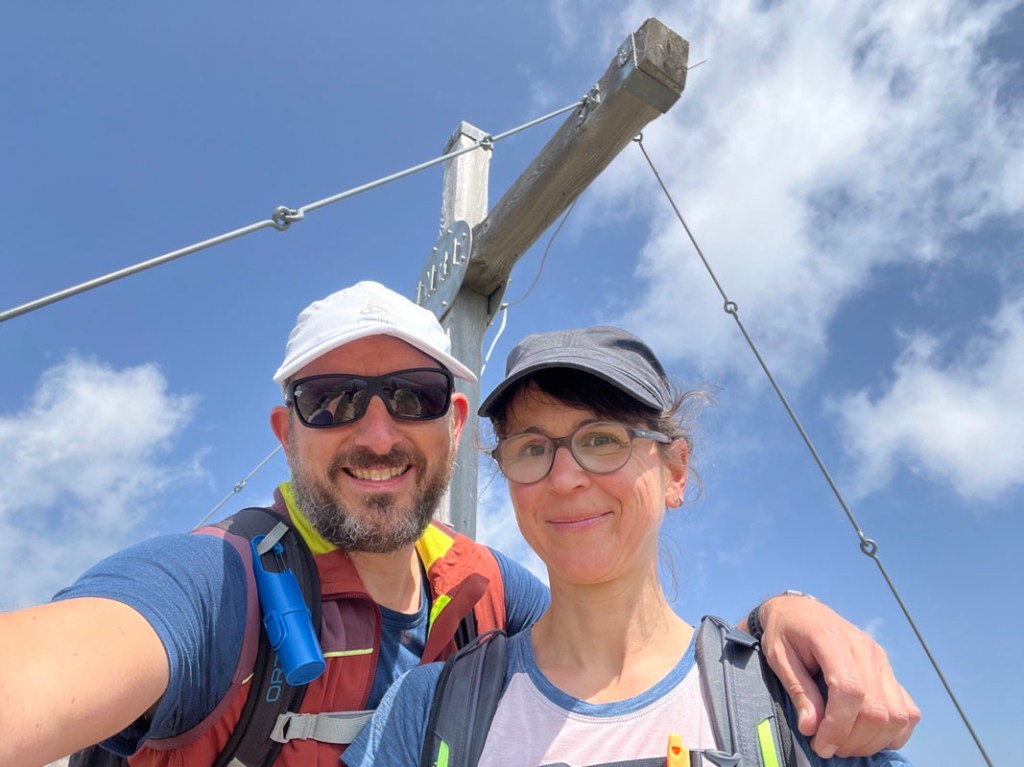 Nun haben wir uns eine Pause verdient, im Windschatten auf der Südseite finden wir ein feines Plätzchen in der Sonne. Die mitgebrachten Jause schmeckt uns beiden, die Aussicht ist in Ordnung, aber es wird komisch diesig! Später erfahren wir, dass dies die Auswirkungen der Waldbrände in Kanada sind… unglaublich!