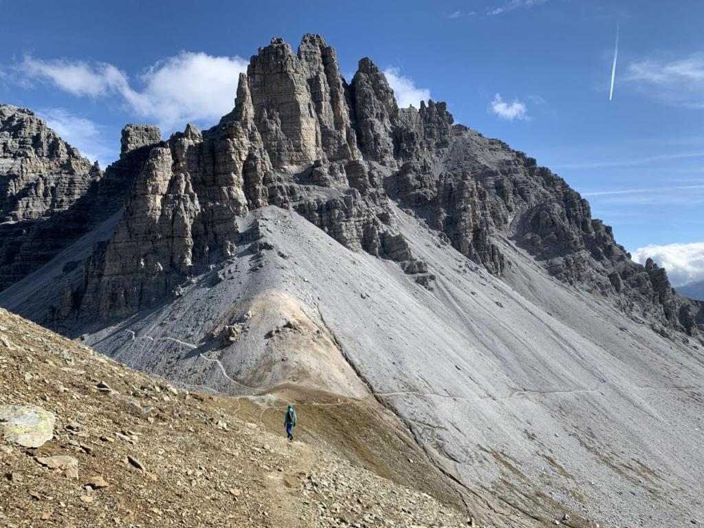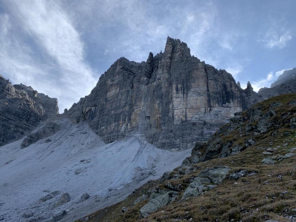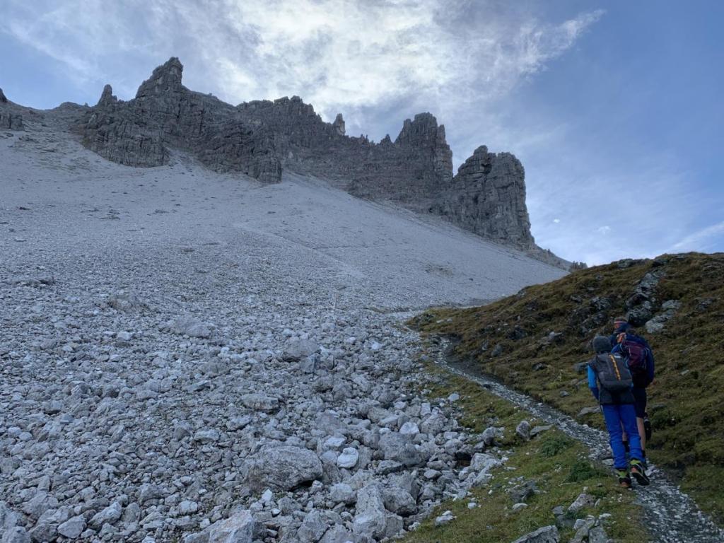 Es weht ein unguter Südföhn, der gefühlsmäßig immer stärker wird. Wir queren unter der beeindruckenden Riepenwand, der direkte Weg unter der Felswand ist allerdings wegen Steinschlag gesperrt.