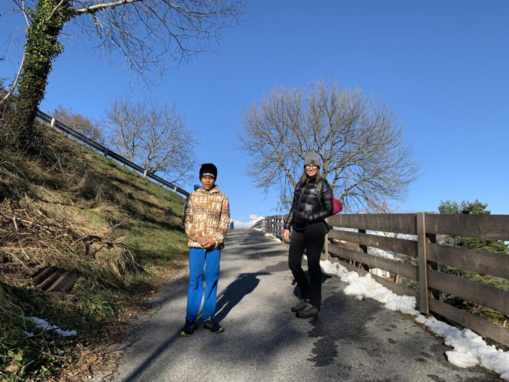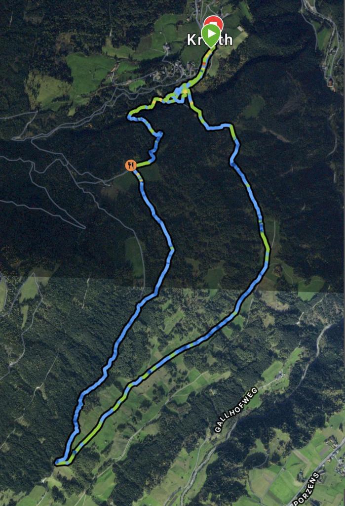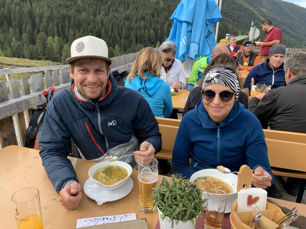 Im Gasthaus Stockerhof gönnen wir uns ein Mittagessen, das sowohl qualitativ wie quantitativ zu überzeugen weiß. Wir sitzen direkt in der Sonne, dennoch sind unsere Finder bald so klamm, dass Letu zum Essen Handschuhe anziehen muss.
