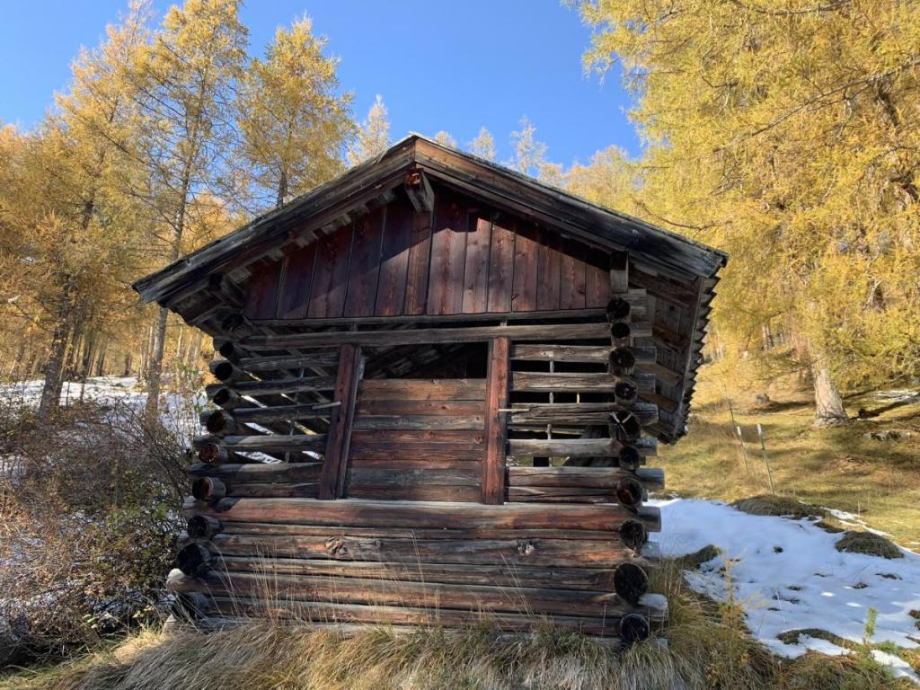 Der Kontrast von Schnee, gelben Lärchen, brauner Wiese und tiefblauem Himmel ist wunderschön, fast möchte man nicht weitergehen vor lauter Staunen.
