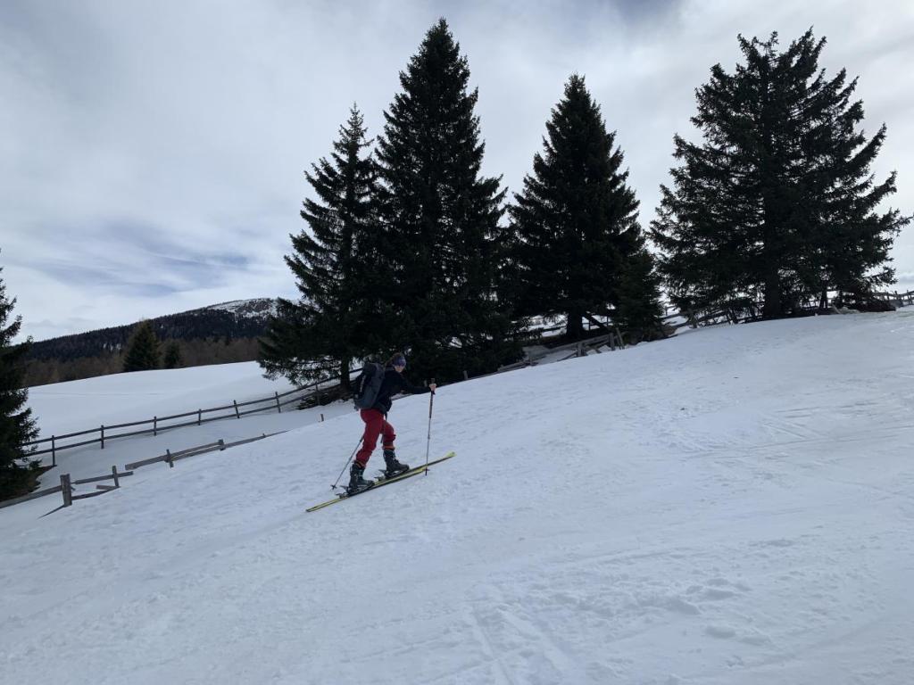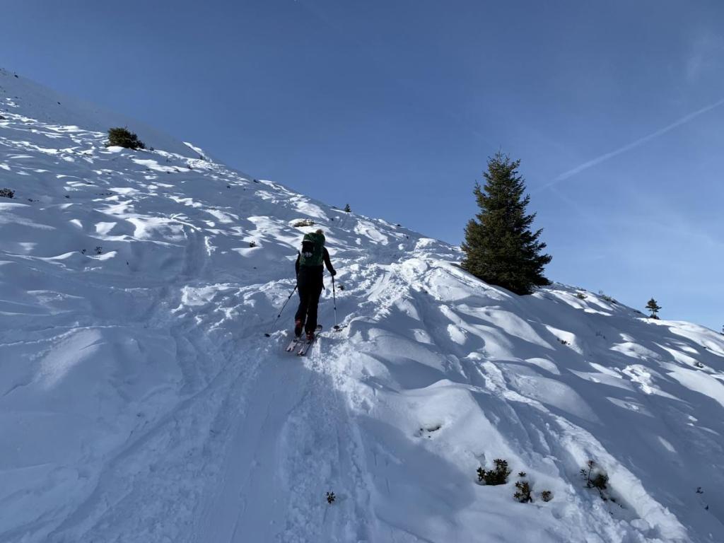 Am Ende der Rodelbahn wechseln wir ins freie Gelände. Die Schneehöhe reicht für den Aufstieg, die Abfahrt wäre hier wohl kein so großes Vergnügen.