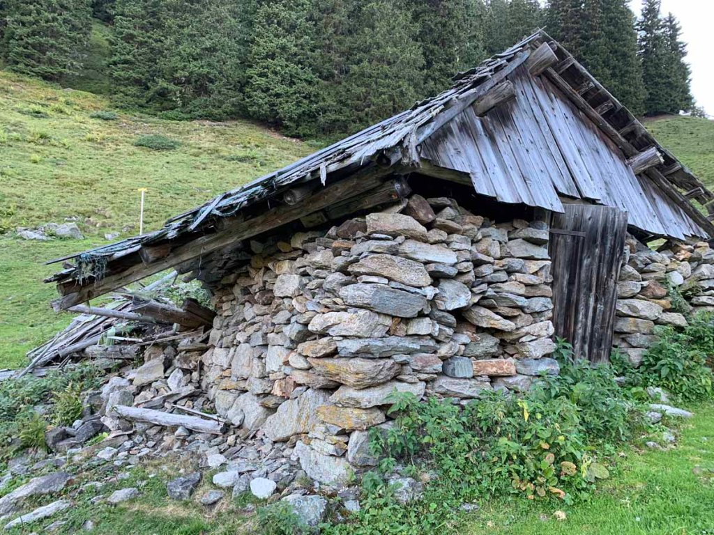 Vorbei an einem beeindruckend ruinösen Stadl wandern wir weiter aufwärts. Diese Seite des Kammes liegt schon im Schatten, aber das hat im Aufstieg nur Vorteile.