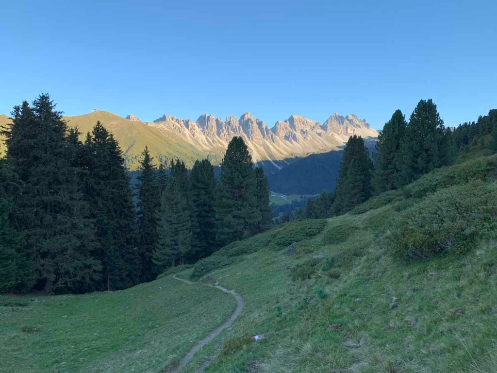 Als sich die Wiesen öffnen, tut sich uns ein wunderschöner Blick auf den Altar Tirols auf, die Serles…