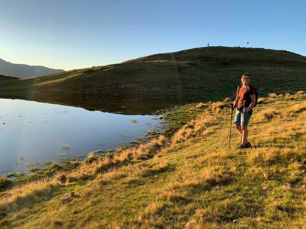 Beim Salfeinssee treten wir vom Schatten in die Sonne, für die Pause ist das perfekt. Der See hat heute ein wenig mehr Wasser, das macht sich auf den Fotos gut!