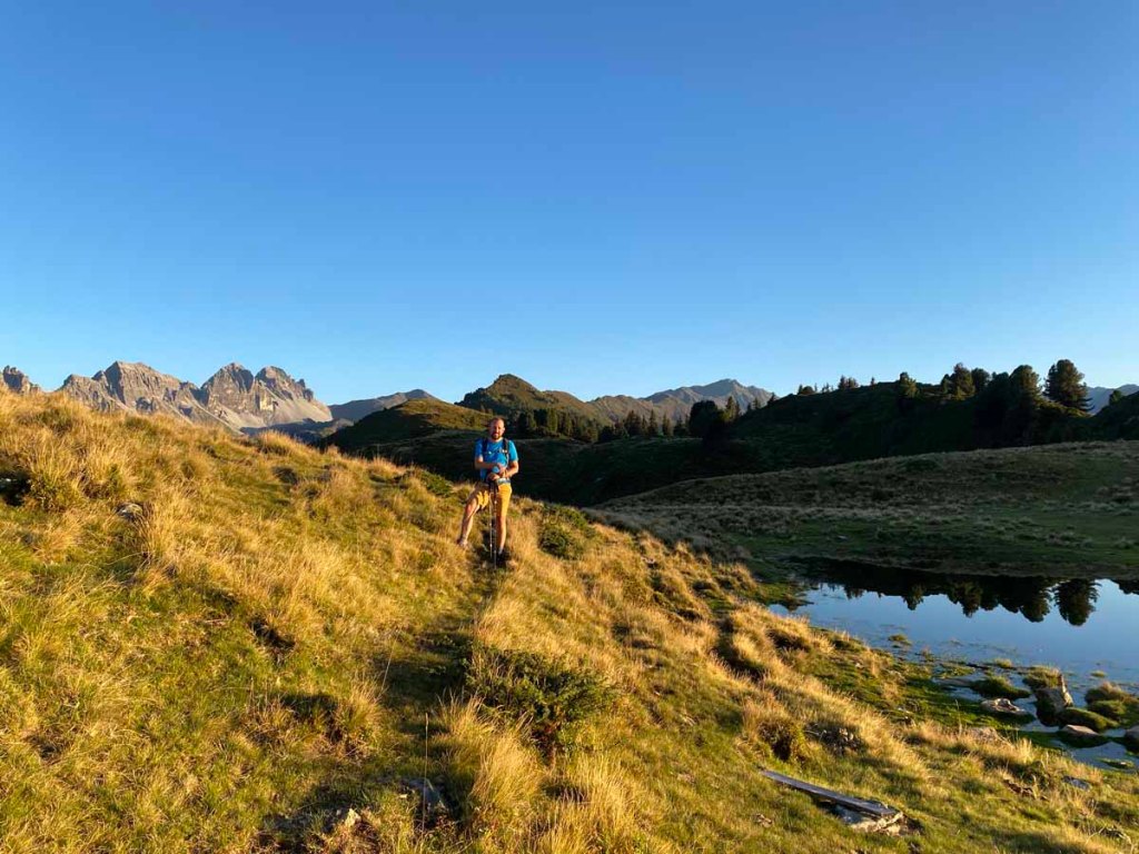 Die Sonne geht nun hinter dem Rosskogel unter, ich werfe noch einen Blick hinüber zum Weißstein (2.640m), den ich vorletztes Jahr besteigen konnte (hier als kleine Spitze in der Mitte des Kamms zu sehen).