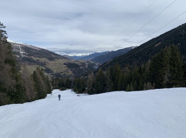 Ab dem Boden ist die Bahn überraschend gut beieinander, und Schnee liegt hier eigentlich auch noch genug. Überrascht muss ich feststellen, dass wir nicht die einzigen „Unerschrockenen“ sind, sogar zwei Tourengeher sind am Weg.