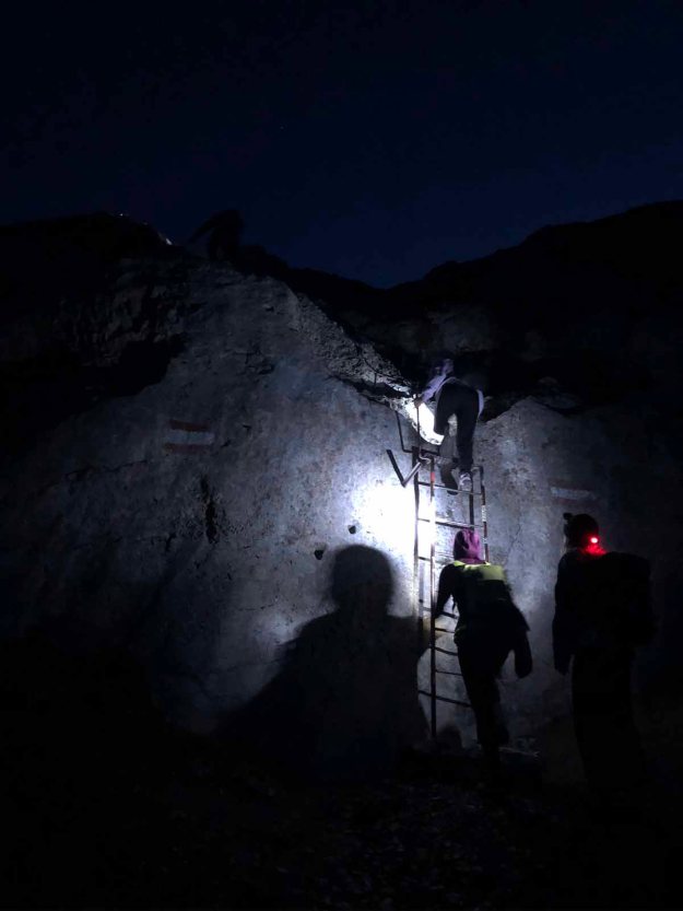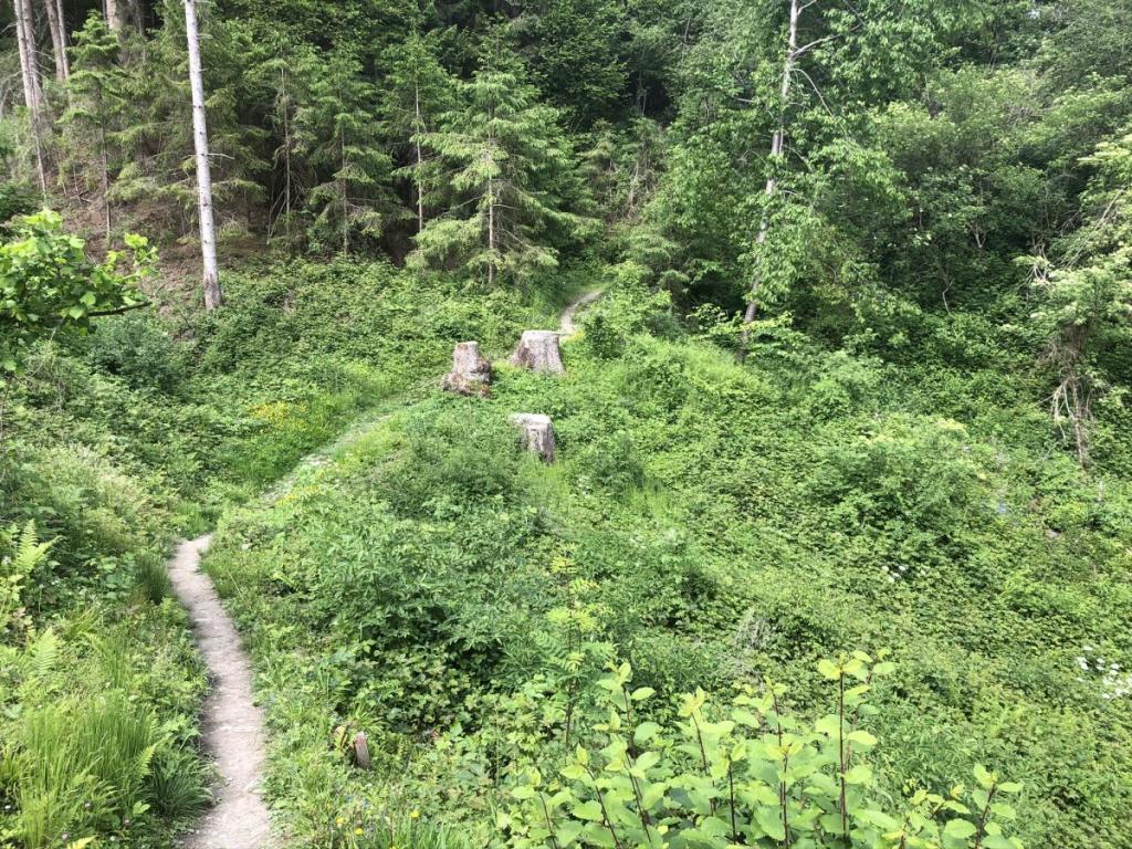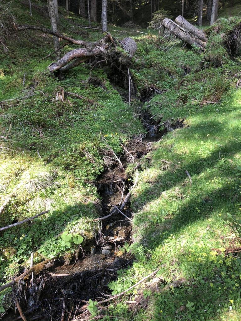 Es ist nicht mehr so weit zum Ziel, dem noch sichtbaren Bergwerksstollen am Nösslachjoch. Immer wieder sehen wir Ausbisse mit Schwarzerde, dem hier vorkommenden Kohlegestein.