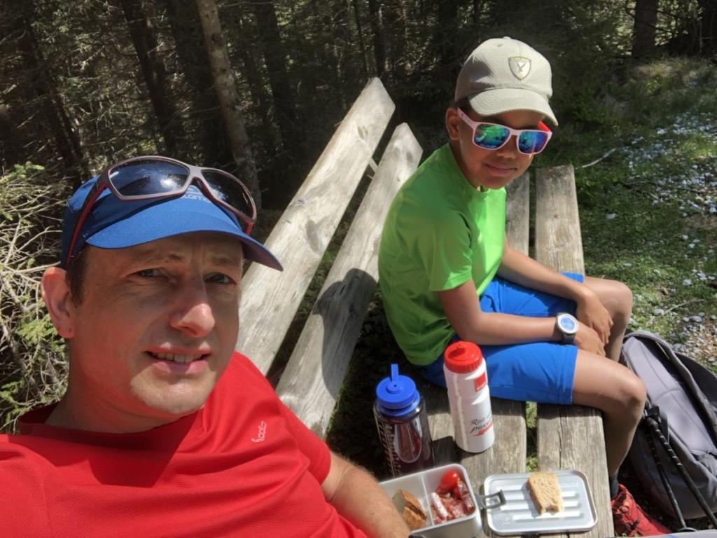 Unterwegs finden wir mal ein Wolkenloch, und können eine feine Jause auf einer Bank genießen. Da ist die Sonne dann schon angenehm…