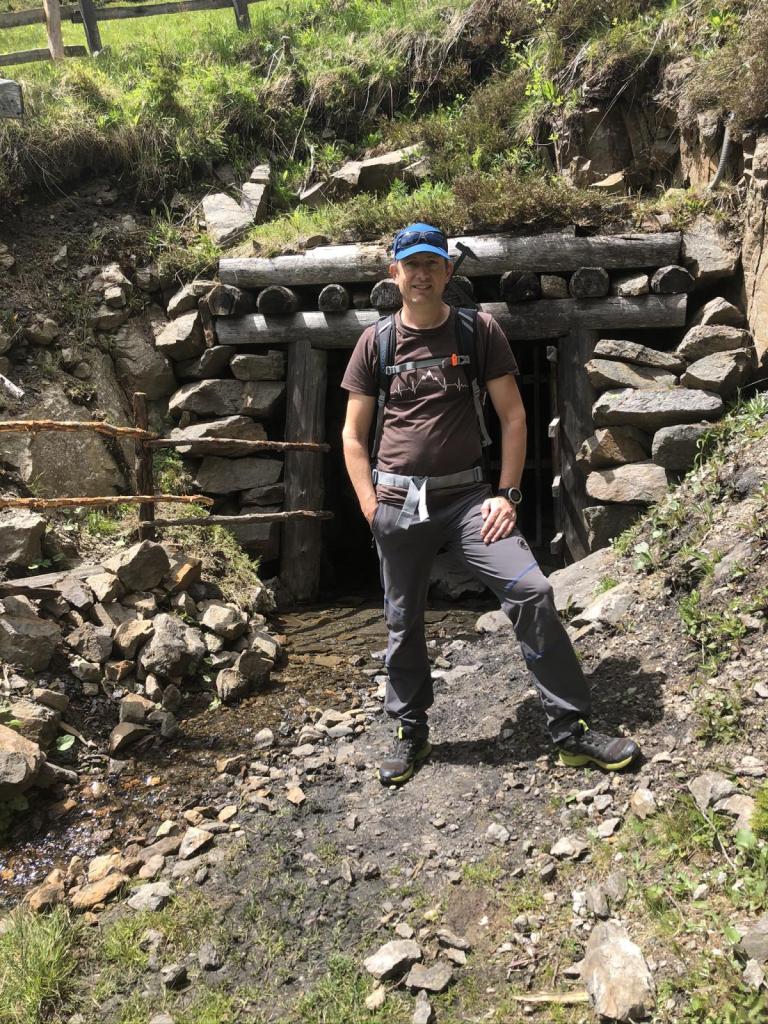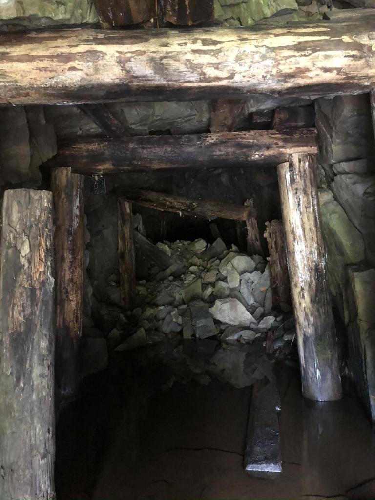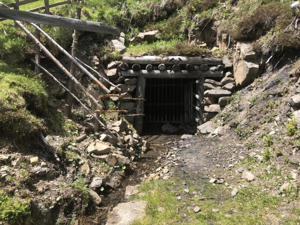 … das Mundloch zum Bergwerk ist mit einem Gitter verschlossen, innen sieht man auch, dass nach ein paar Metern ein Verbruch vorhanden ist… trotzdem schaut die Zimmerei und das Mauerwerk relativ neu aus. Das dürfte also nicht ganz original sein…