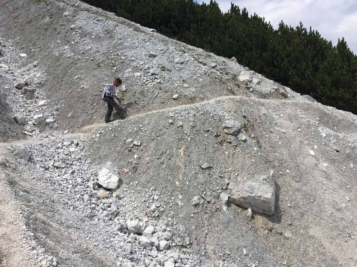 Es ist nicht mehr so weit zum Ziel, dem noch sichtbaren Bergwerksstollen am Nösslachjoch. Immer wieder sehen wir Ausbisse mit Schwarzerde, dem hier vorkommenden Kohlegestein.
