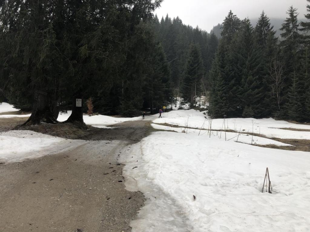 Schon kurz nach der Abzweigung vom See liegt eine geschlossene Schneedecke auf der Forststraße. Der Schnee ist sehr angenehm zu gehen und wir benötigen die Schneeschuhe noch nicht.