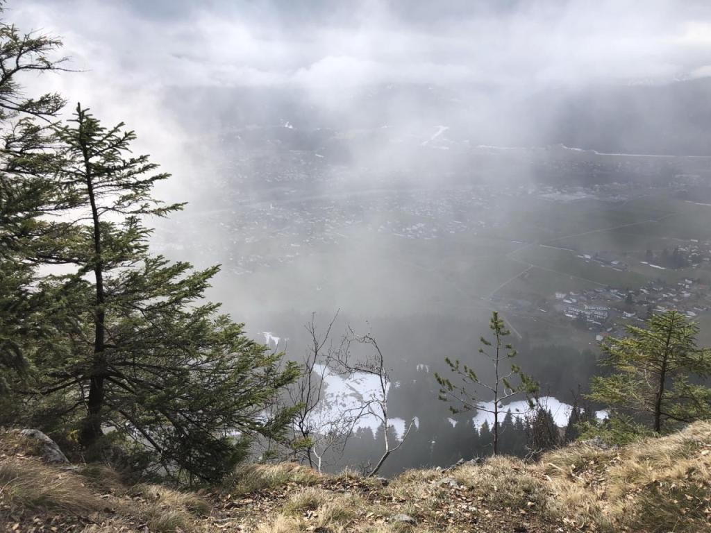 Dementsprechend ist die Aussicht auf den Talkessel. Wir sind allerdings froh, wenn kurze Wolkenfenster einen Blick ins Tal ermöglichen.