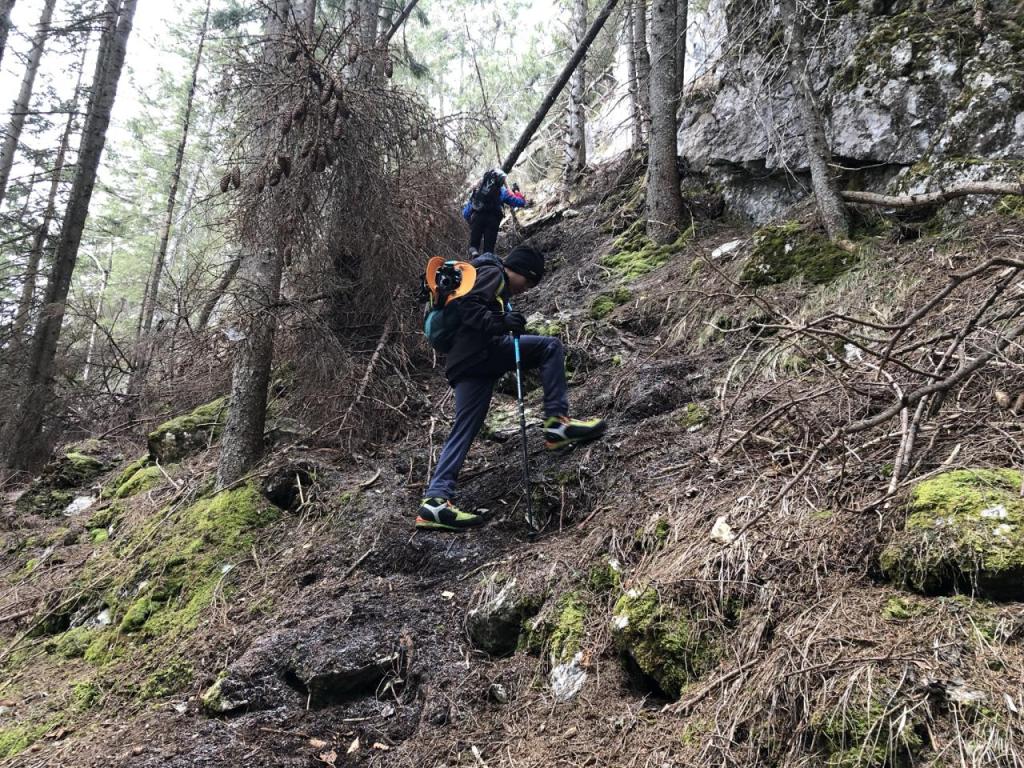Erst müssen wir über ein wenig Fallgut klettern, dann ist der Weg richtig Steil unterhalb einer Felswand. Doch stet, Fuss vor Fuss wird auch dieser Teil erklommen…