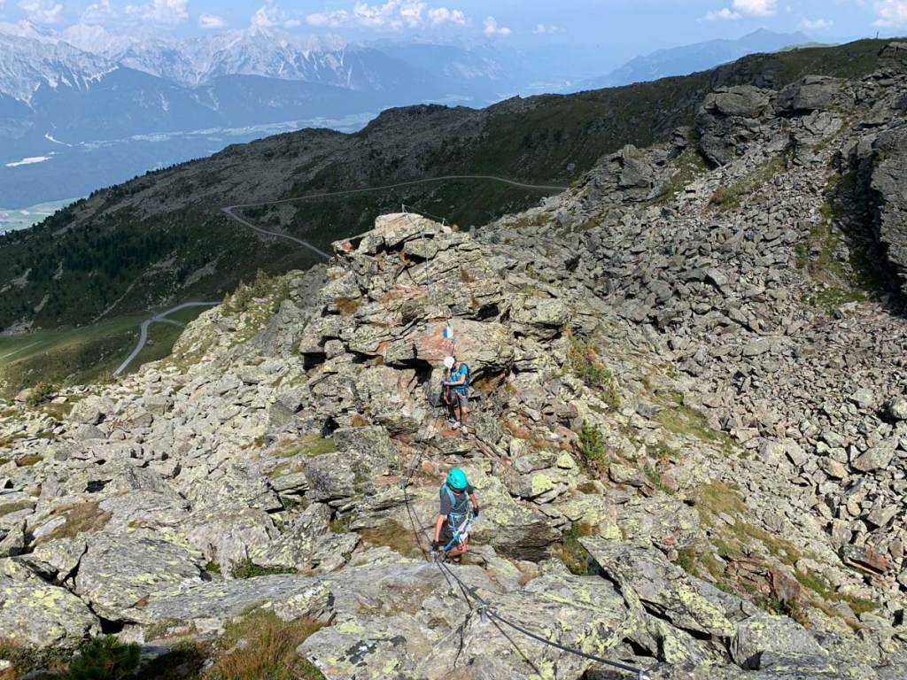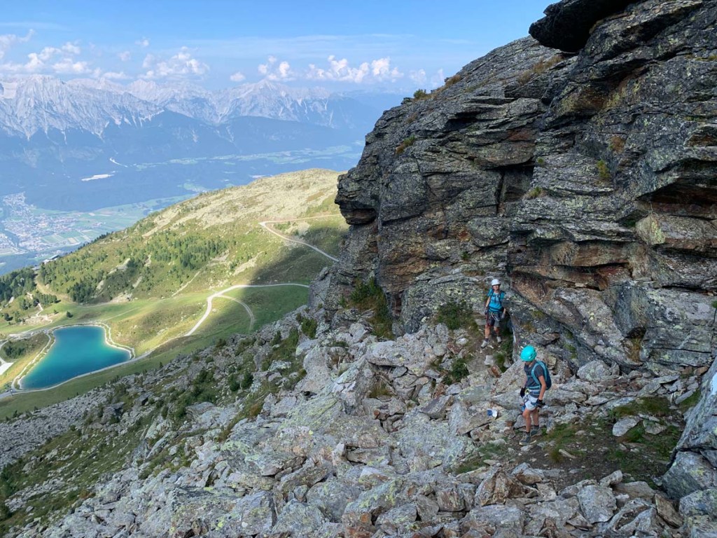 Was bietet sich für einen Freitag Nachmittag als sportliche Aktivität an… naja, das zähle ich jetzt nicht alles auf, aber Eines geht immer wieder: Ein kurzer Klettersteig. Wir haben uns zum Einstimmen den Glungezer Klettersteig ausgesucht, Biggi ist mit Georg dabei, Letu und ich. Wir benutzen die Bahn zum Hochfahren, damit verkürzen wir die Strecke immens.