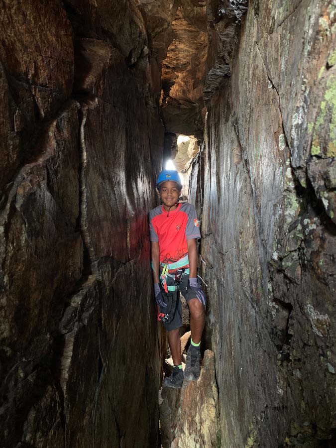 Eine lustige Stelle ist das „Versteck des Bergmändchens“, ein knapper Schlitz, der in die Höhe führt.