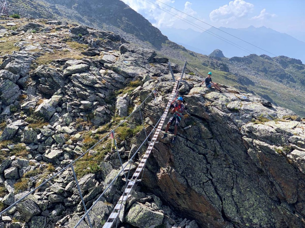 Wir erreichen eine Seilbrücke, ein Blick auf die Uhr zeigt uns, dass es knapp werden könnte mit der Gondel-Abfahrt, wenn wir noch weitergehen. Also beschließen wir, hier Ende zu machen. Die Buben probieren noch ein paar Stunts an der Brücke, während Biggi und ich unsere Sachen einpacken.