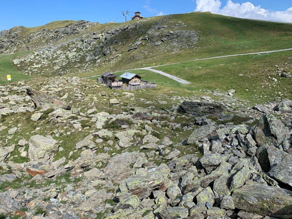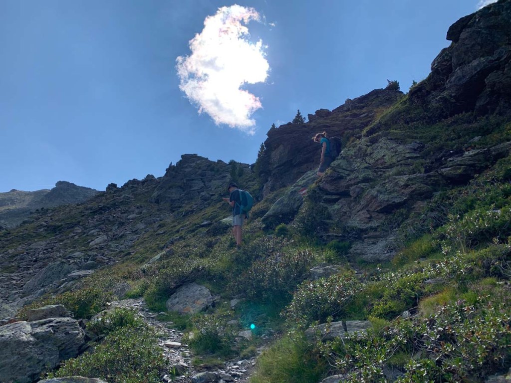 Wir wandern wieder zurück zur Kellerjochhütte, holen unsere Rucksäcke, verabschieden uns, dann steigen wir ab, in Richtung Hecherhaus.