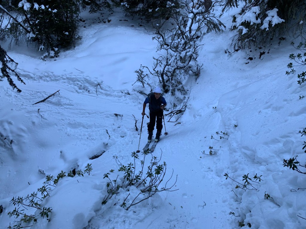 Ein Schluck Tee ist auch noch drinnen, dann fahren wir ab. Zuerst nehmen wir die Abfahrt über die Forststraße, später erreichen wir das Skigebiet. Für´s Gelände ist einfach zu wenig Schnee…