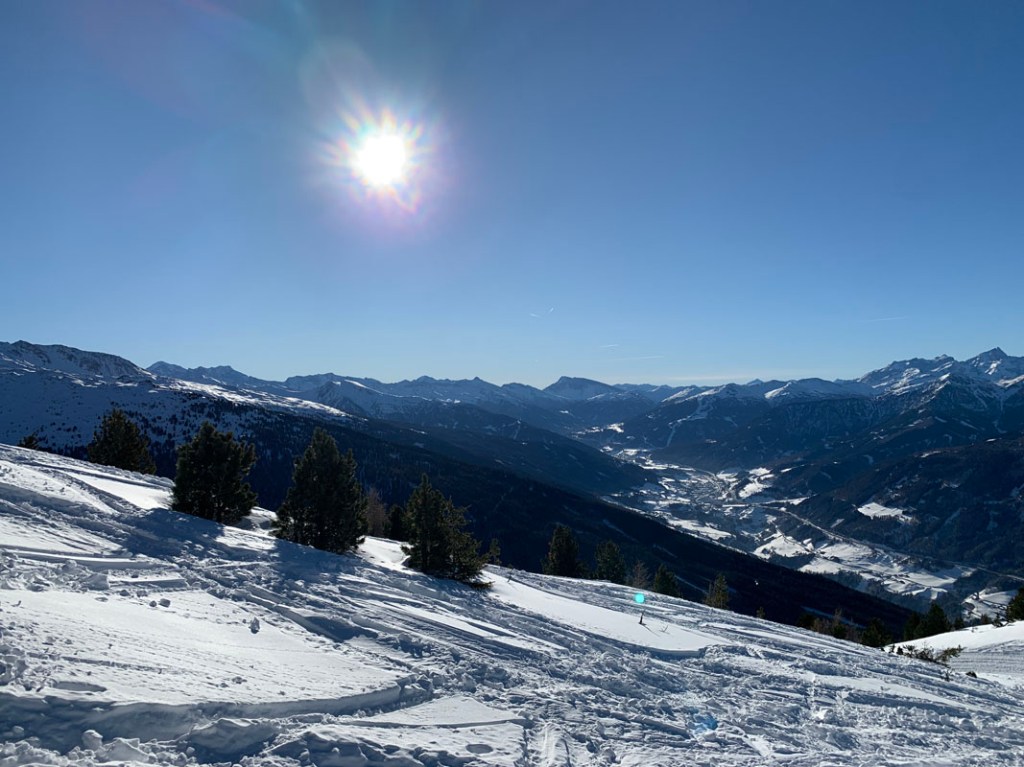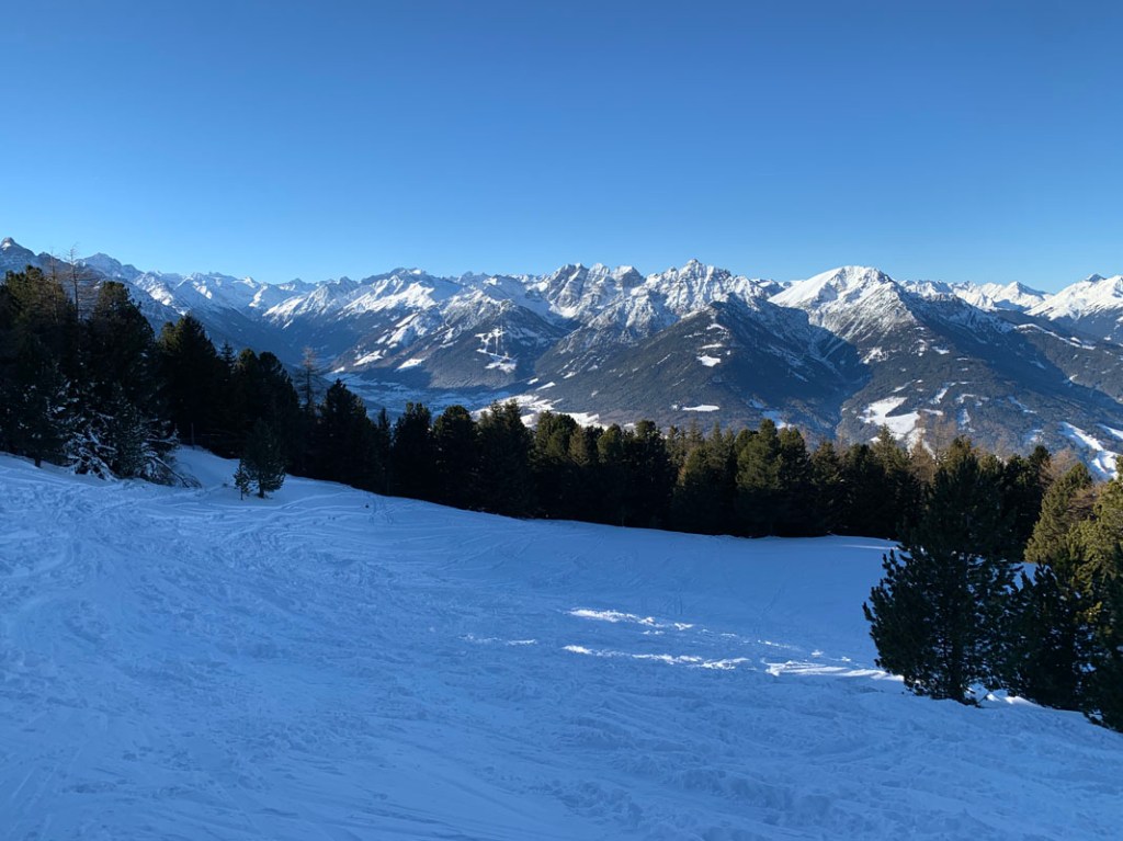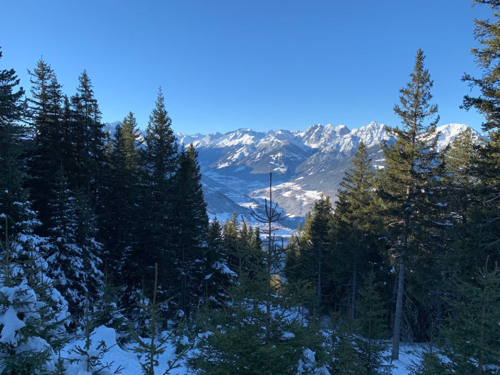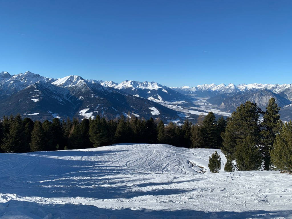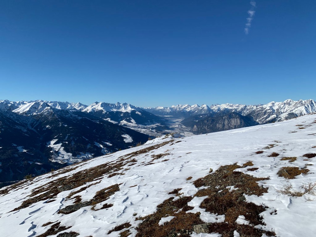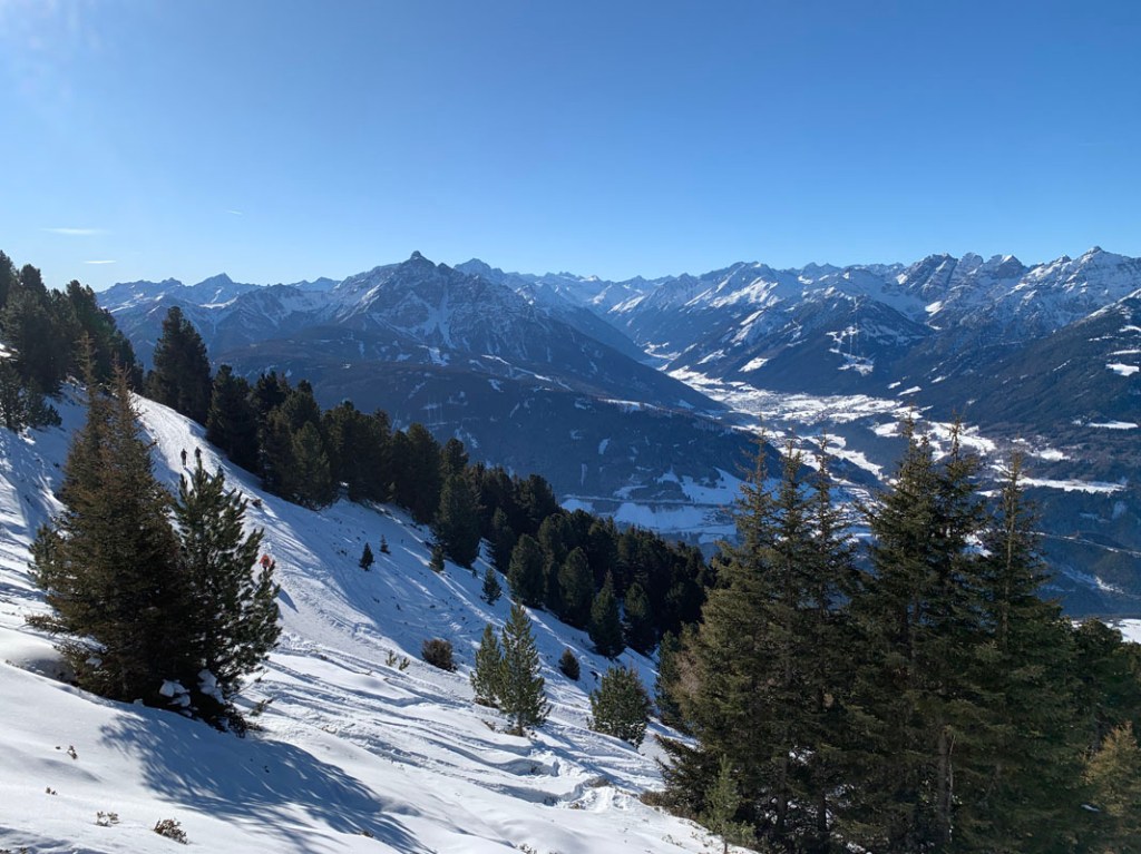 Der Blick schweift ins Inntal, es liegt zwar nicht viel Schnee, aber dennoch wirkt es ein wenig winterlich…