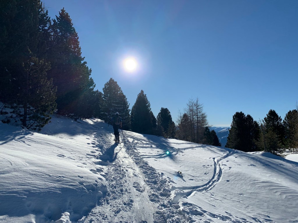 Ein kurzer Aufstieg entlang der Piste, dann zweigen wir auch wieder in den Wald ein. Es sind einige Tourengeher am Weg.