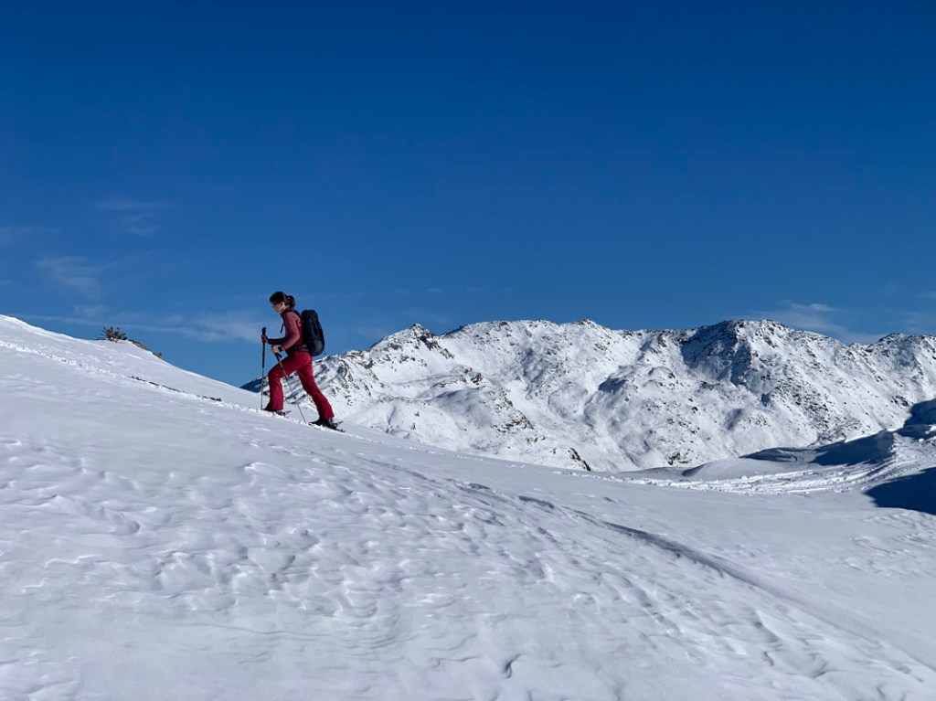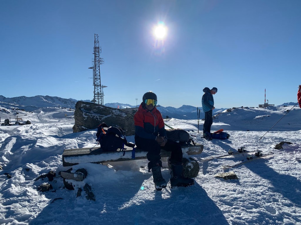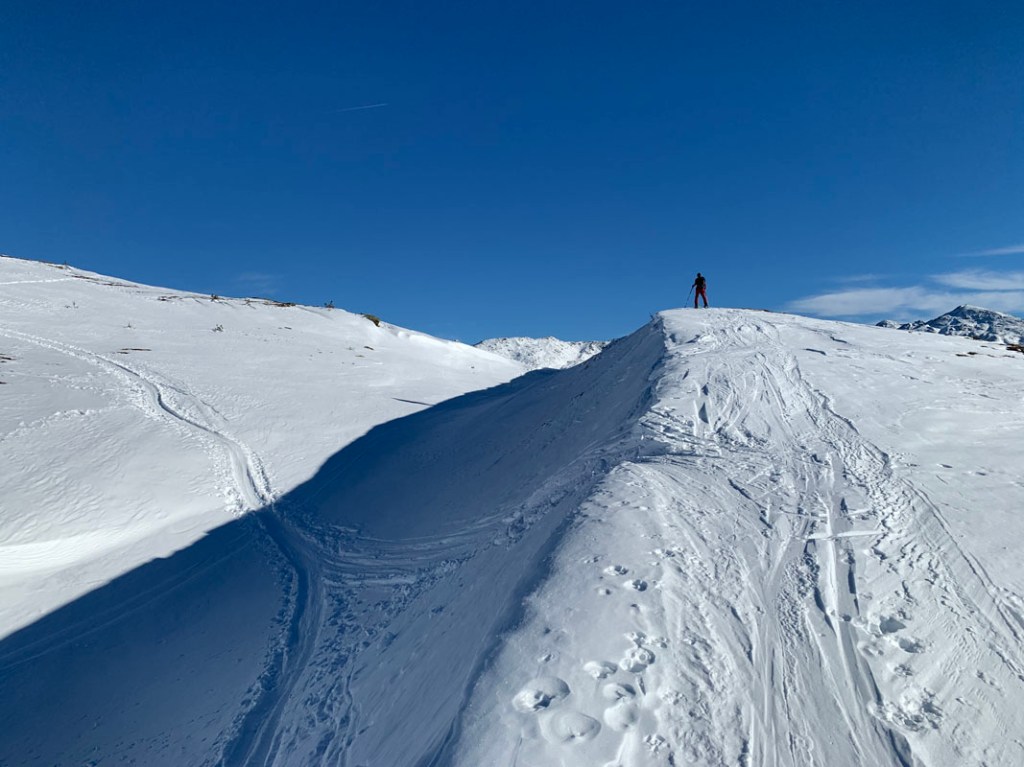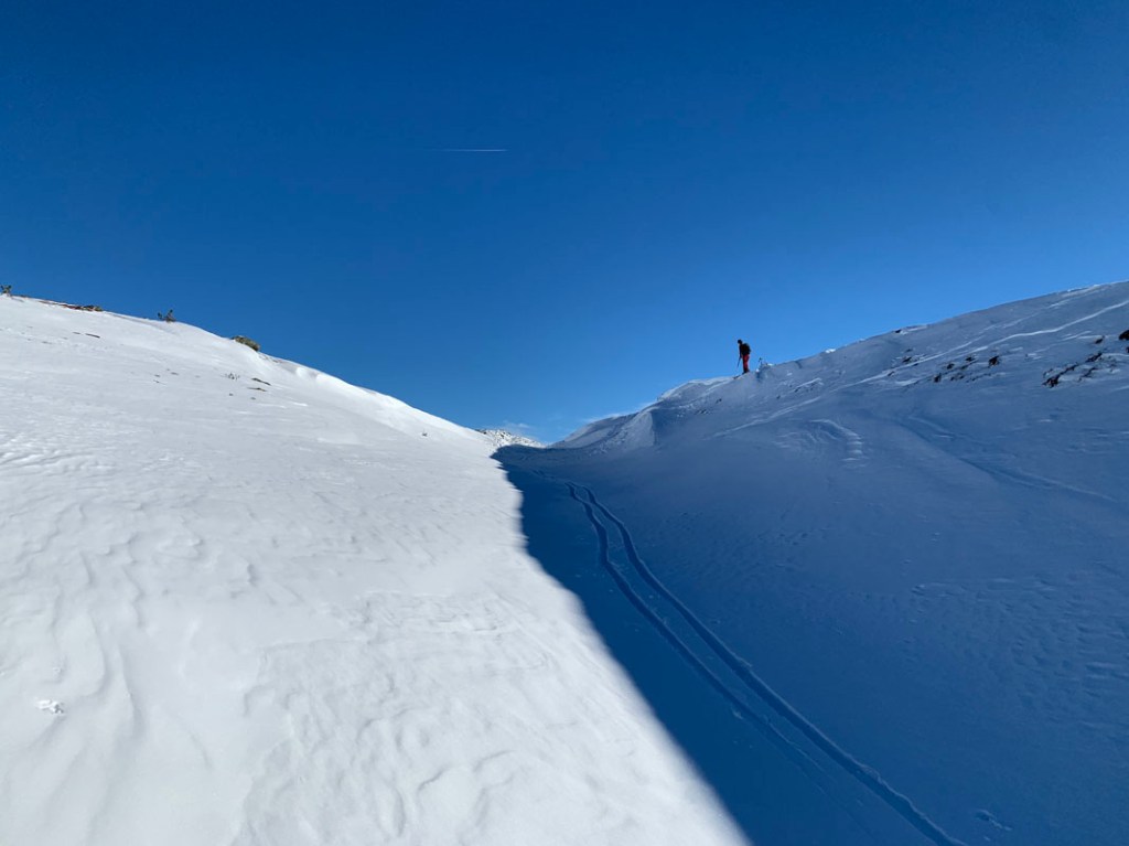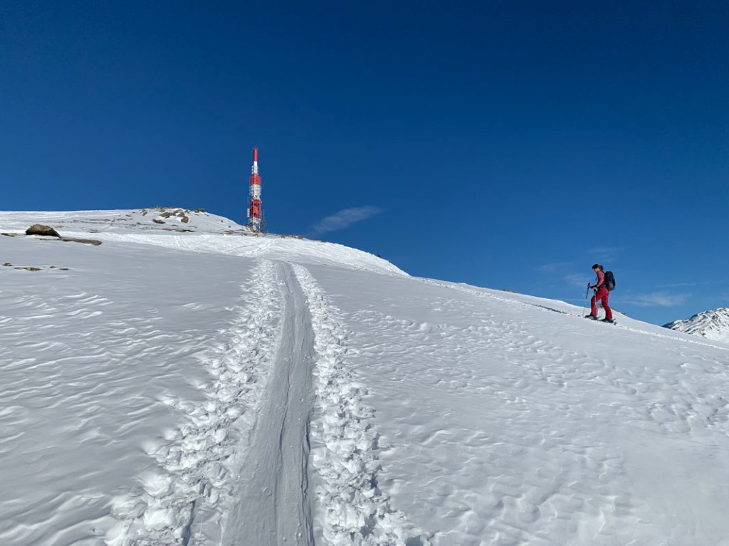 Dennoch finden wir eine feine Spur bis zum Gipfel, ohne die Ski ausziehen zu müssen…