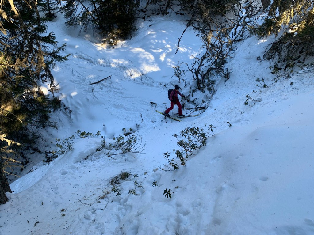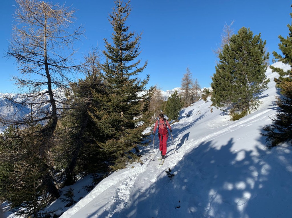 Eine feine Skispur im Wald hat es uns angetan, ein paar steilere Passagen müssen bewältigt werden, dafür ist hier nichts los. Die meisten Tourengeher bevorzugen halt doch die Piste!