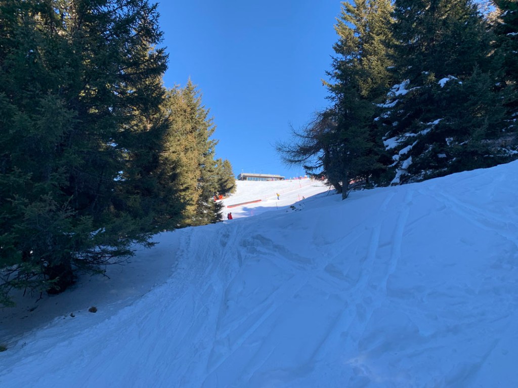 Durch eine Schneise sehen wir dann auch schon die Bergstation auf 1.969m). Wir bleiben allerdings im Wald auf unserer einsamen Spur.