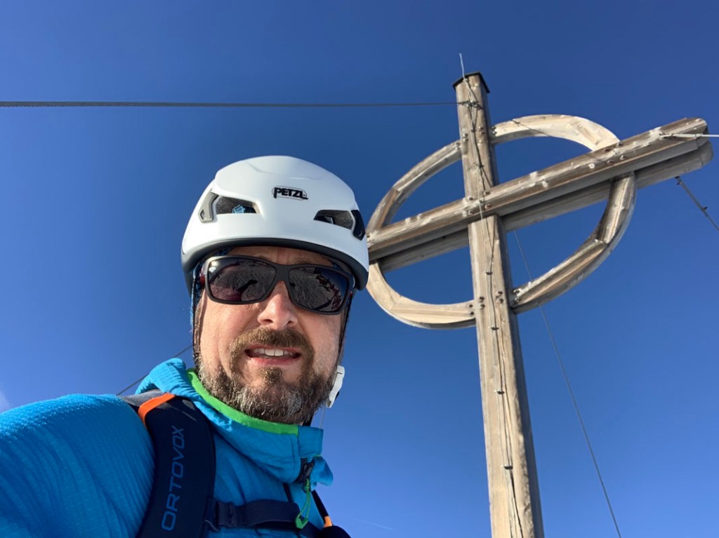 Zufrieden erreichen wir den Gipfel, für Letu eine große Freude. Eine Skitour mit Gipfelkreuz ist halt doch was tolles!