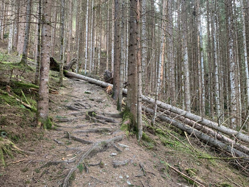 Am Steig sehen wir immer wieder die Auswirkungen der letzten Föhnwellen. Überall liegen sturm-gefällte Bäume.
