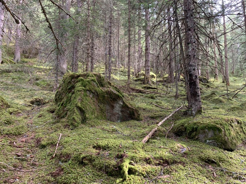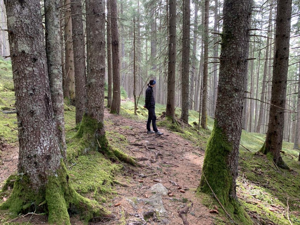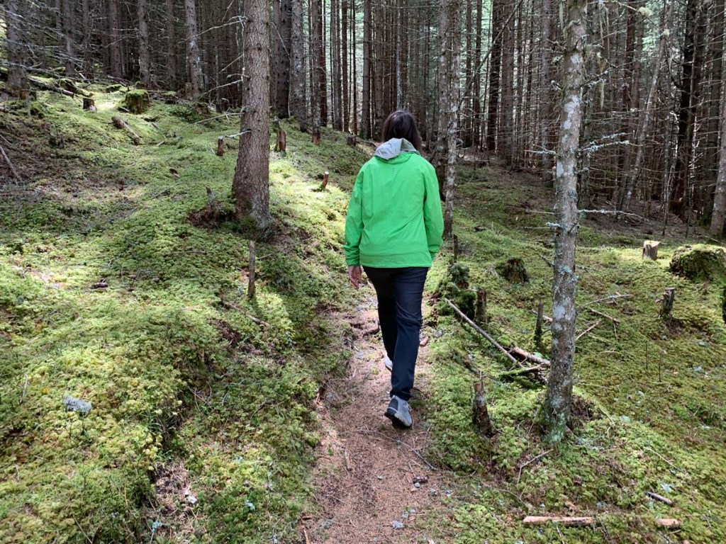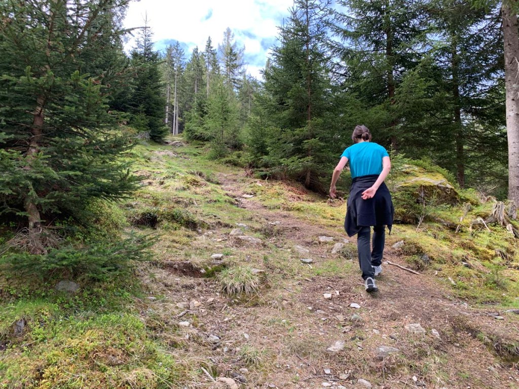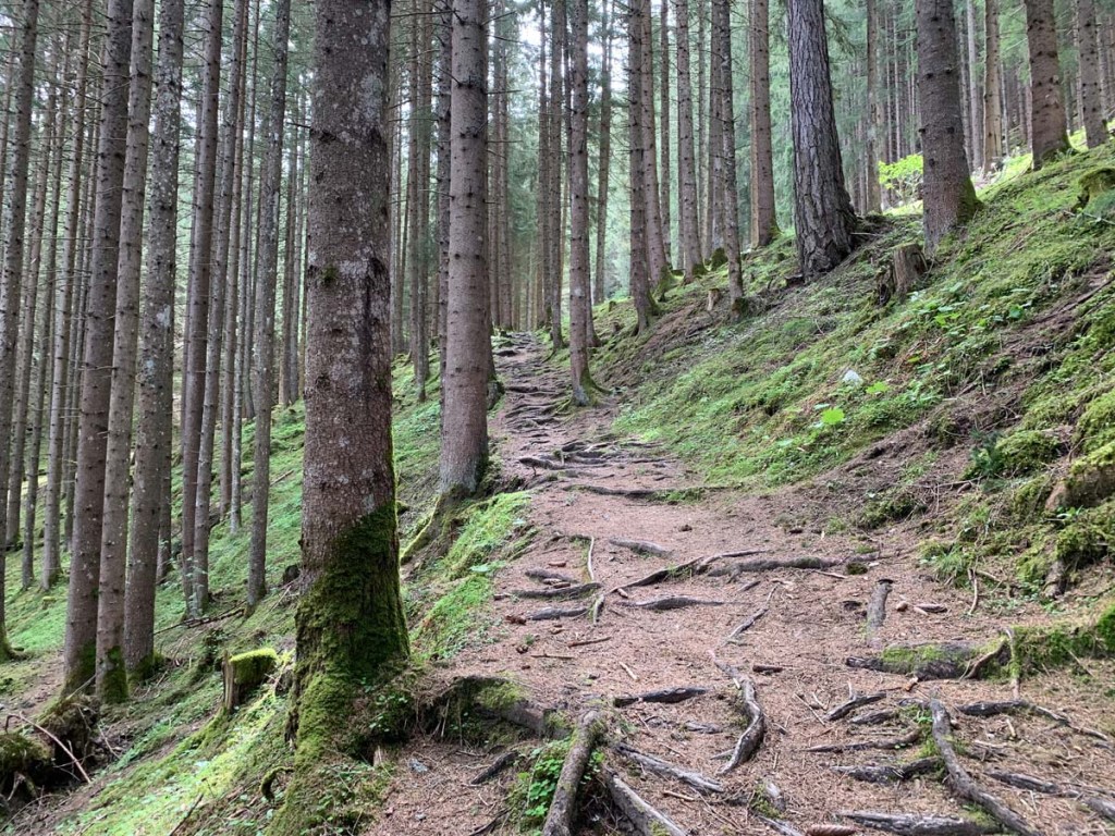 Über den Sepplsteig, einen kleinen Verbindungssteig zwischen den Almen, wandern wir durch moosigen Wald und eng stehende Bäume.