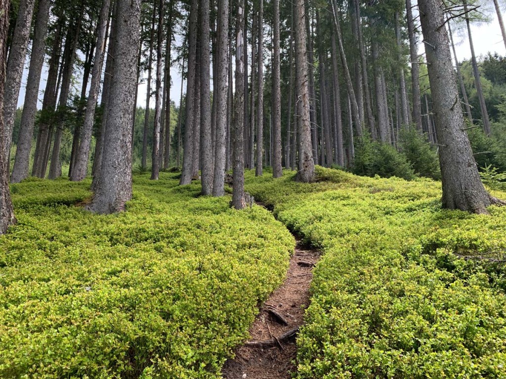 Es ist später geworden als geplant, also schauen wir, dass wir ohne Pause weitergehen. durch ausgedehnte Moosbeerfelder steigen wir ziemlich direkt von der Alm ab ins Tal.